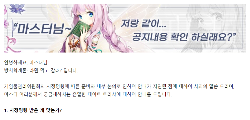 안녕하세요! 일상을 나누는 로안입니다. 어른을 위한 모바일 미소녀 게임 '방치학개론'에서 이번에 '시정명령'을 게임물관리위원회에서 받았다고합니다. 일단 이 게임이 원래 노출이 심한 게임이기는 합니다만, 가장 큰 문제가 되었던 게임의 콘텐츠 중 하나인 '은밀한 데이트 - 트리샤'가 가장 문제가 되었습니다.