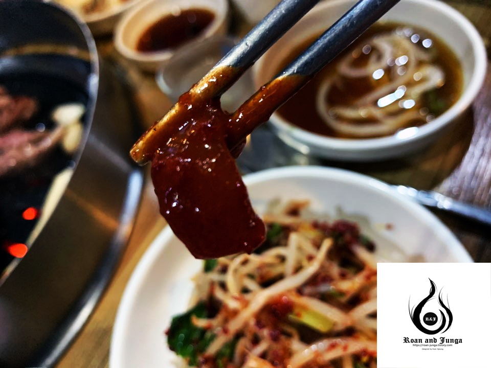 거기에 불판에 올려져 있는 빨간 소스에 찍먹하면 그 조합이